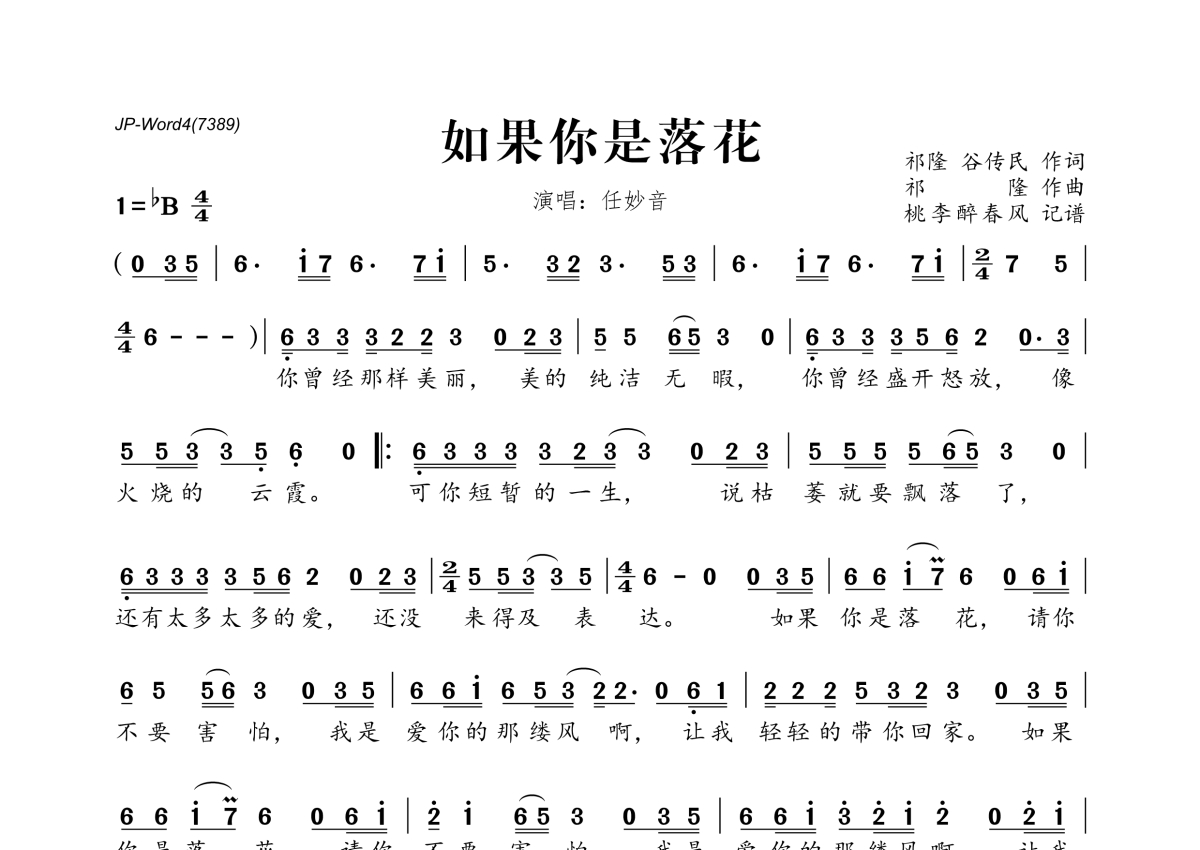 《如果你是落花》是任妙音演唱的一首歌曲,拍号为4/4拍,这份简谱共有一张高清图谱,图谱由 @桃李醉春风 编配上传。