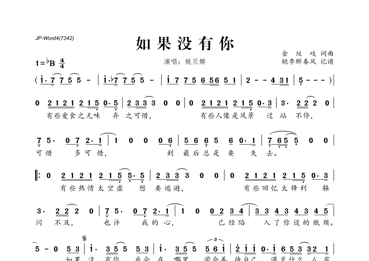 《如果没有你》是姚贝娜演唱的一首歌曲,拍号为4/4拍,这份简谱共有一张高清图谱,图谱由 @桃李醉春风 编配上传。