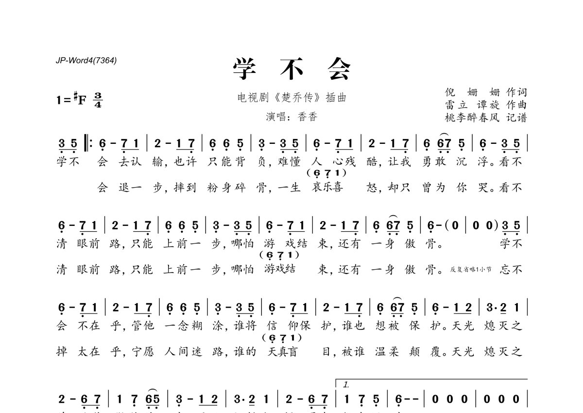 《学不会》是香香演唱的一首歌曲,拍号为3/4拍,这份简谱共有一张高清图谱,图谱由 @桃李醉春风 编配上传。