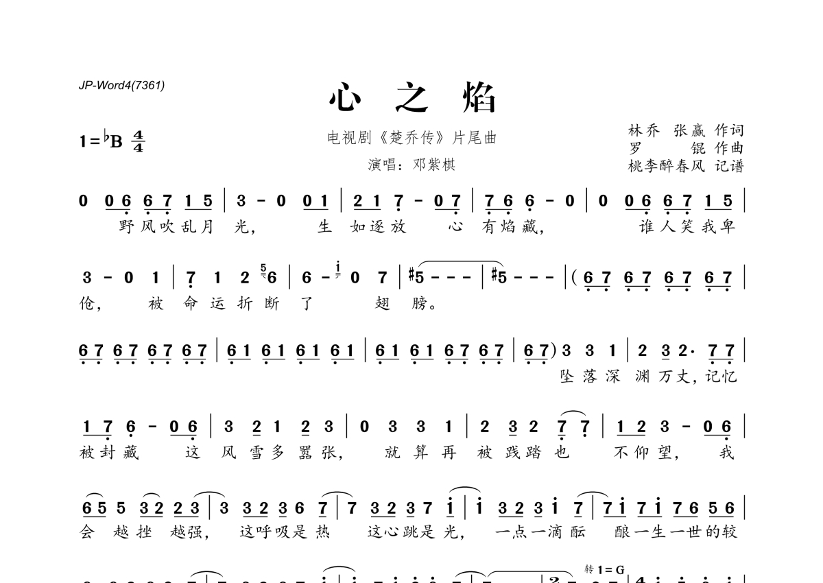 《心之焰》是G.E.M.邓紫棋演唱的一首歌曲,拍号为4/4拍,这份简谱共有一张高清图谱,图谱由 @桃李醉春风 编配上传。