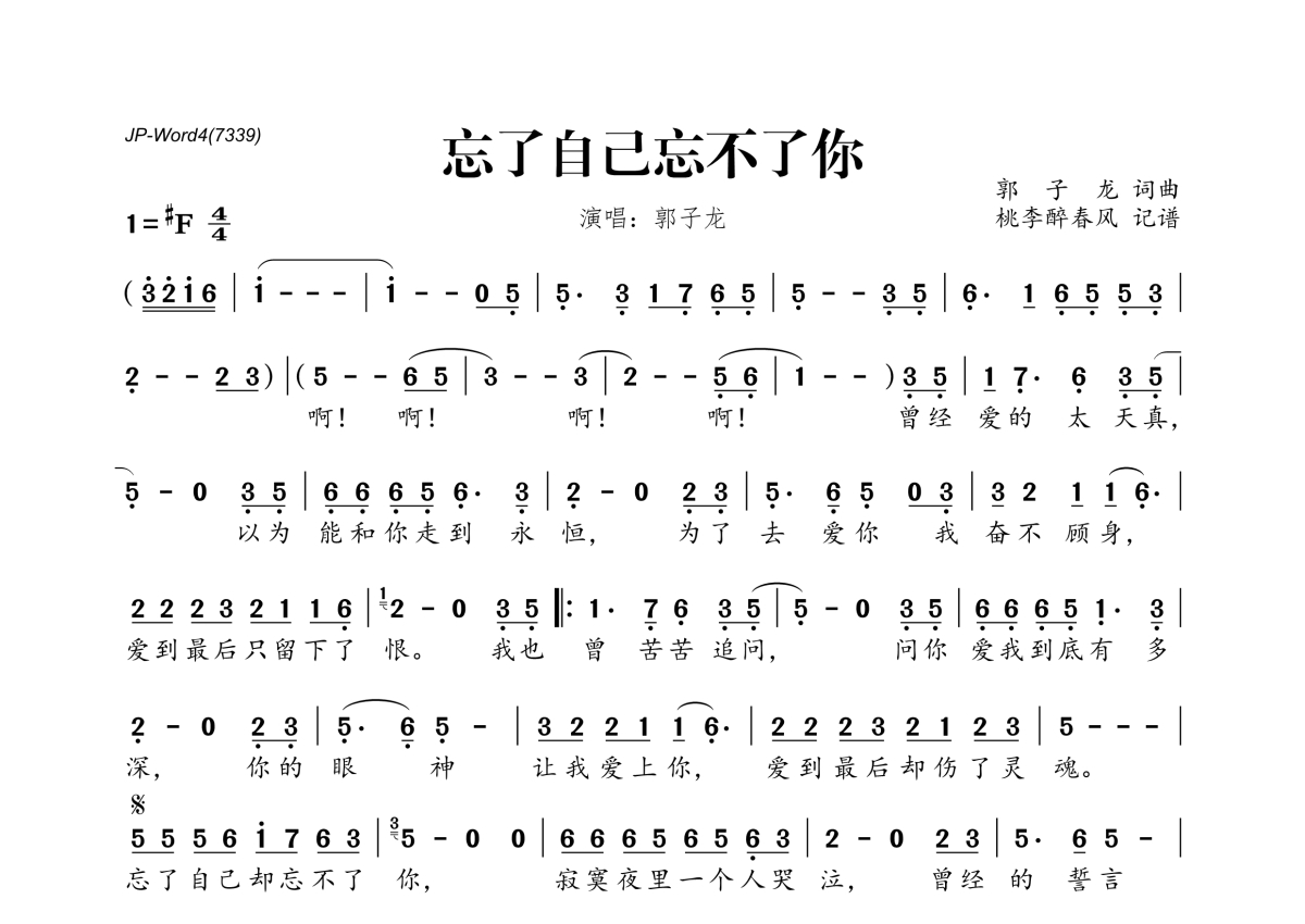 《忘了自己忘不了你》是郭子龙演唱的一首歌曲,拍号为4/4拍,这份简谱共有一张高清图谱,图谱由 @桃李醉春风 编配上传。