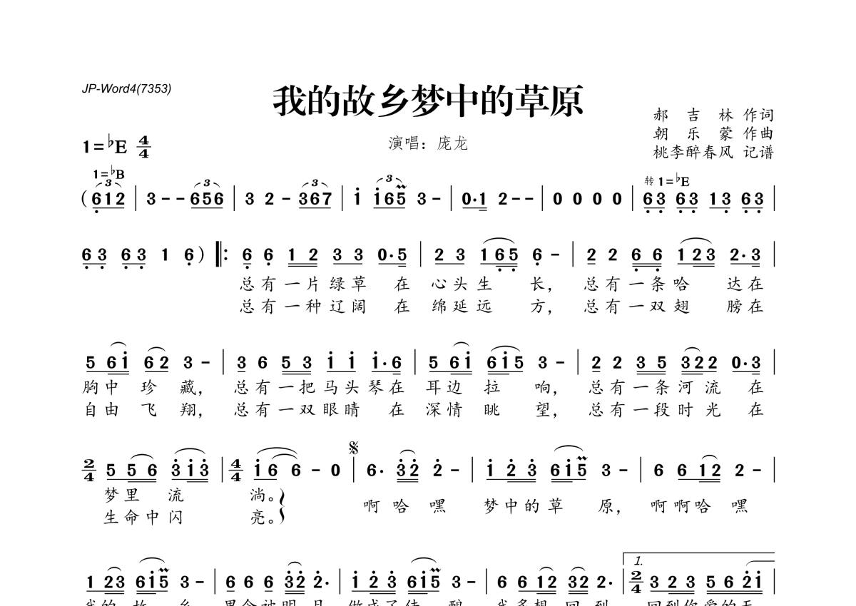 《我的故乡梦中的草原》是庞龙演唱的一首歌曲,拍号为4/4拍,这份简谱共有一张高清图谱,图谱由 @桃李醉春风 编配上传。