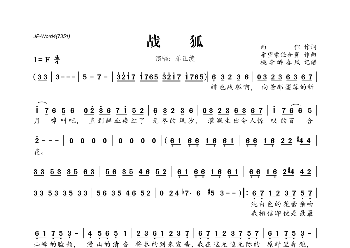 《战狐》是乐正绫演唱的一首歌曲,拍号为4/4拍,这份简谱共有两张高清图谱,图谱由 @桃李醉春风 编配上传。