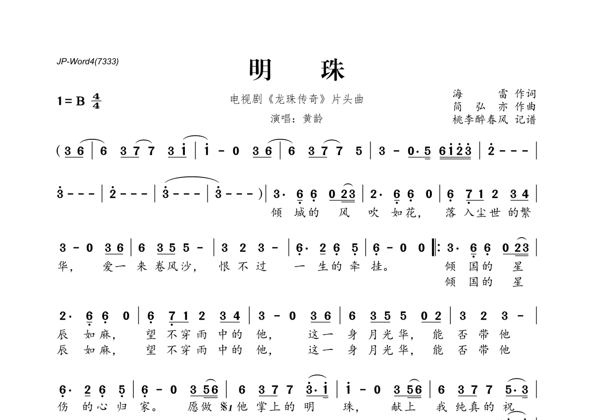 《明珠》是黄龄演唱的一首歌曲,拍号为4/4拍,这份简谱共有一张高清图谱,图谱由 @桃李醉春风 编配上传。