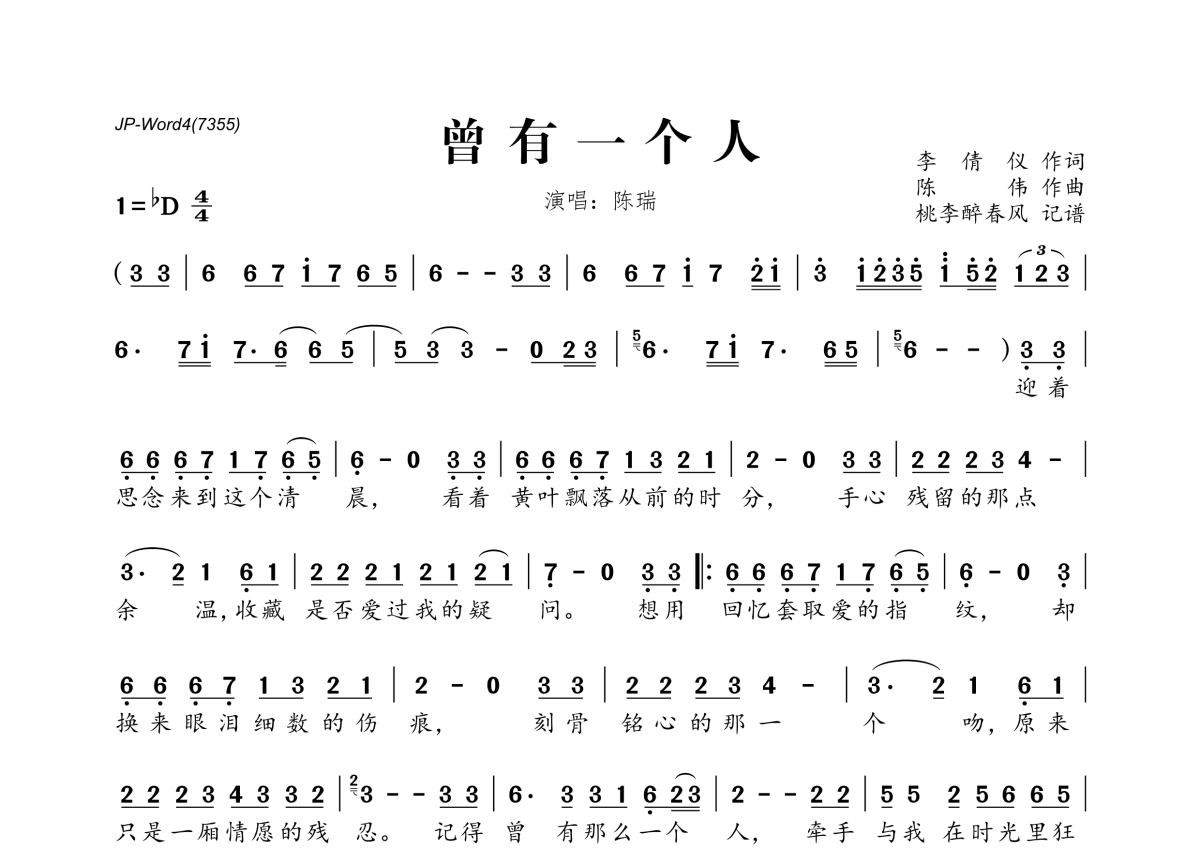 《曾有一个人》是陈瑞演唱的一首歌曲,拍号为4/4拍,这份简谱共有一张高清图谱,图谱由 @桃李醉春风 编配上传。
