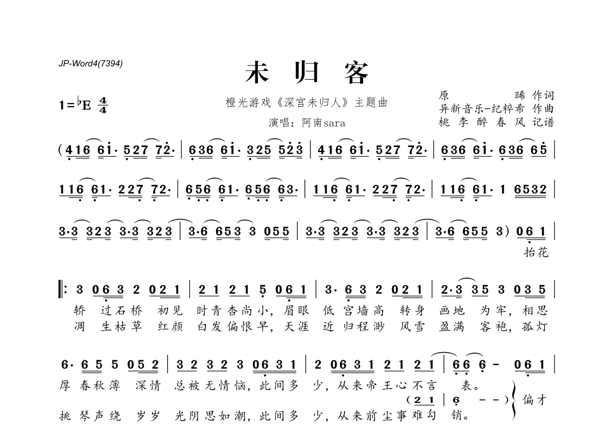 《未归客》是阿南sara演唱的一首歌曲,拍号为4/4拍,这份简谱共有一张高清图谱,图谱由 @桃李醉春风 编配上传。