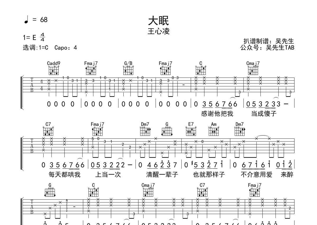 《大眠》是王心凌演唱的一首歌曲,本吉他谱采用的是C调指法编配,这份吉他谱共有两张高清图谱,图谱由 @吴先生TAB 编配上传,图谱使用六线谱编配,包含吉他和弦指法、简谱以及歌词部分,使用这份大眠吉他谱,可以让你更加方便地掌握这首歌曲的弹唱技巧,快来尝试吧。一首虐心情歌,最近在各大视频音乐平台火了起来。大眠六线谱,原调E,变调夹夹第四品,选用C调指法。