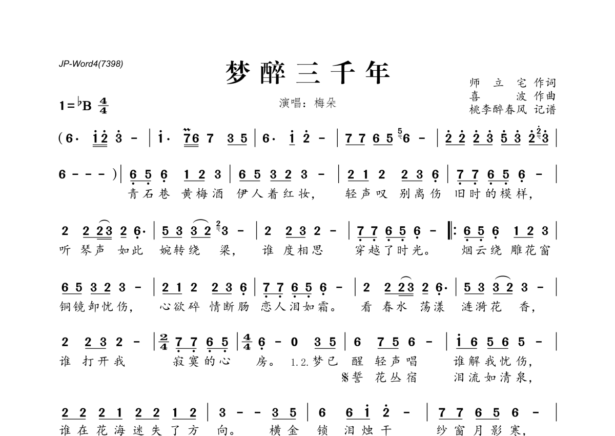 《梦醉三千年》是梅朵演唱的一首歌曲,拍号为4/4拍,这份简谱共有一张高清图谱,图谱由 @桃李醉春风 编配上传。