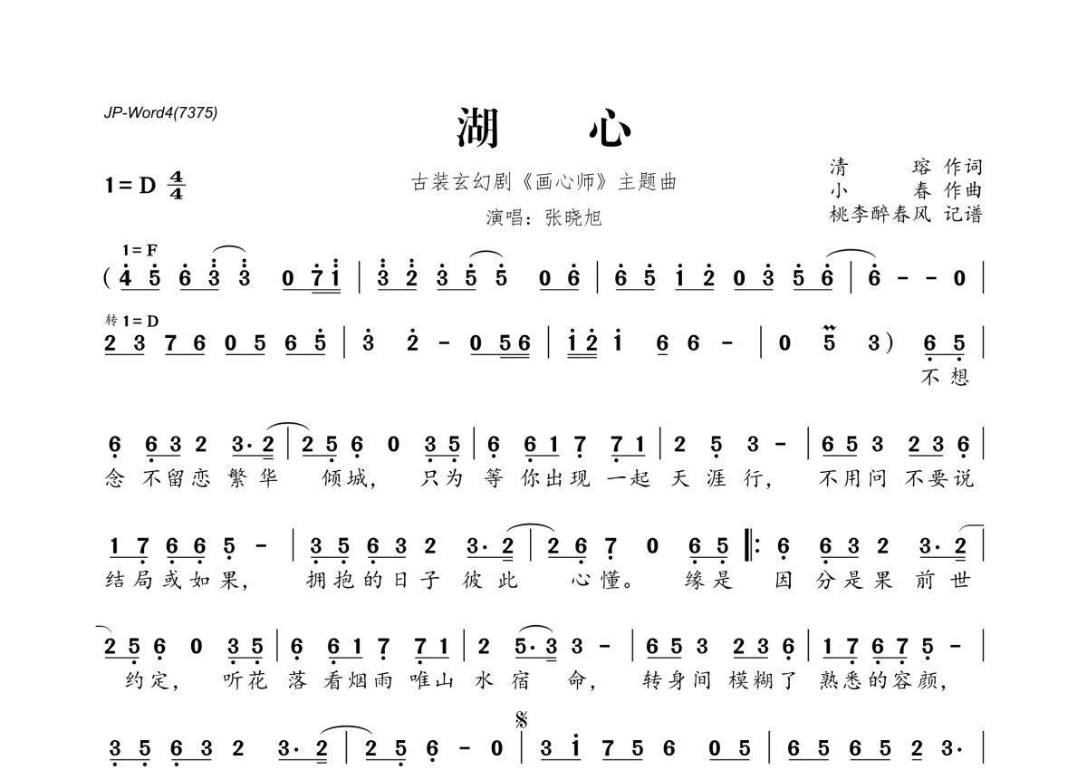 《湖心》是张晓旭演唱的一首歌曲,拍号为4/4拍,这份简谱共有一张高清图谱,图谱由 @桃李醉春风 编配上传。