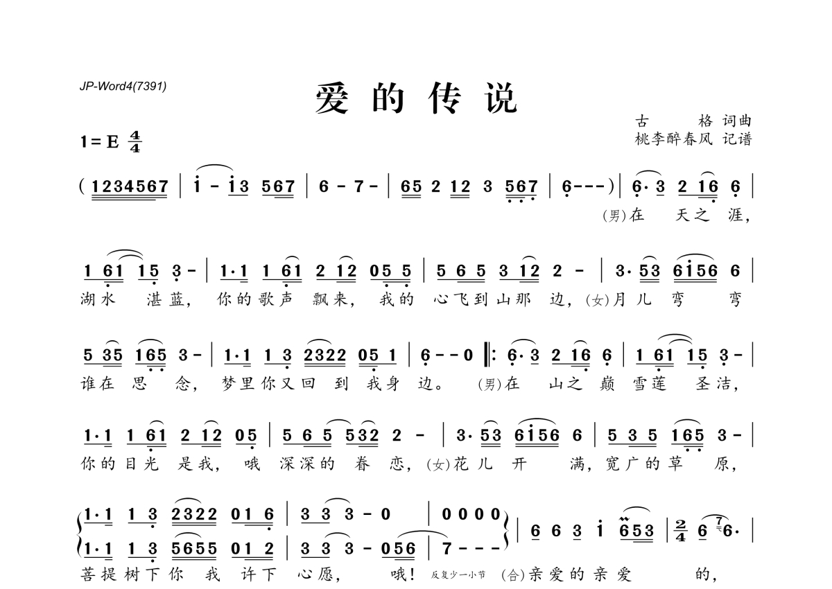 《爱的传说》,拍号为4/4拍,这份简谱共有一张高清图谱,图谱由 @桃李醉春风 编配上传。