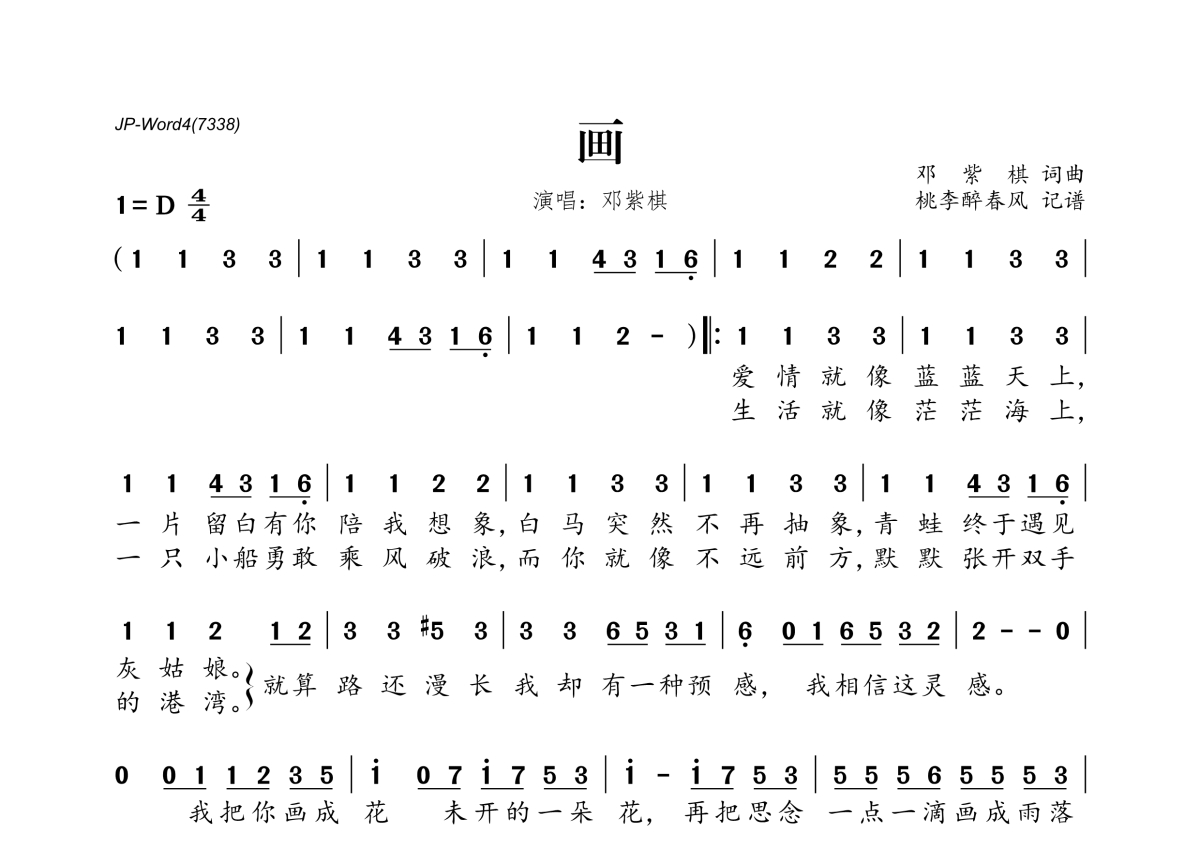 《画》是G.E.M.邓紫棋演唱的一首歌曲,拍号为4/4拍,这份简谱共有一张高清图谱,图谱由 @桃李醉春风 编配上传。