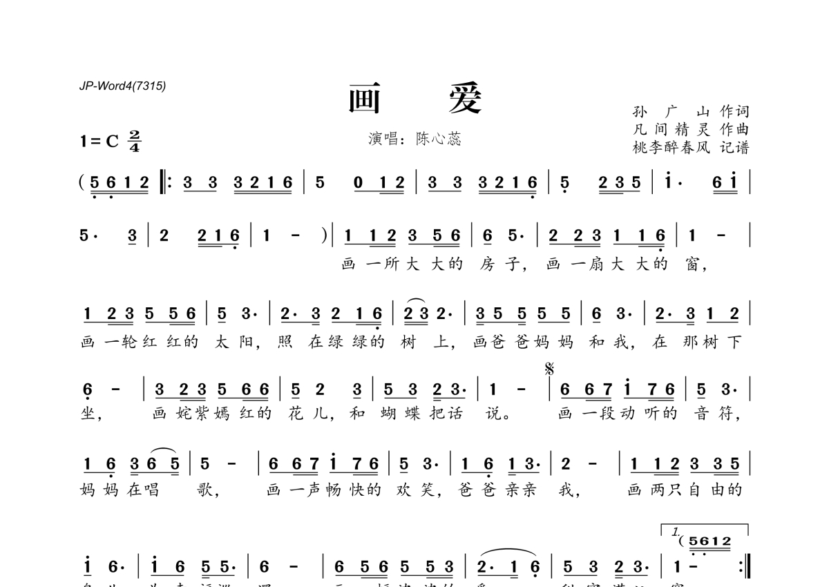 《画爱》是陈心蕊演唱的一首歌曲,拍号为2/4拍,这份简谱共有一张高清图谱,图谱由 @桃李醉春风 编配上传。