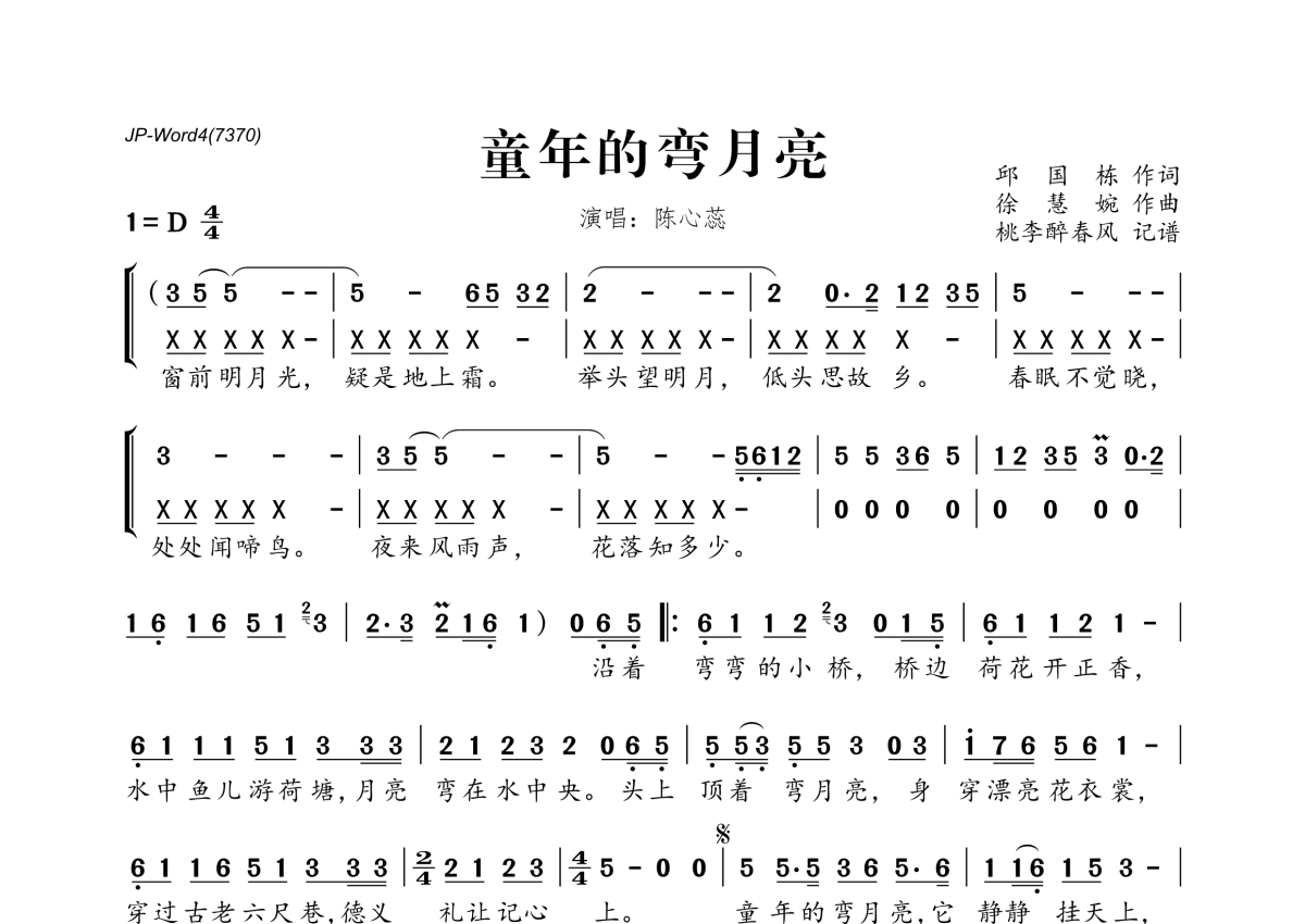 《童年的弯月亮》是陈心蕊演唱的一首歌曲,拍号为4/4拍,这份简谱共有一张高清图谱,图谱由 @桃李醉春风 编配上传。