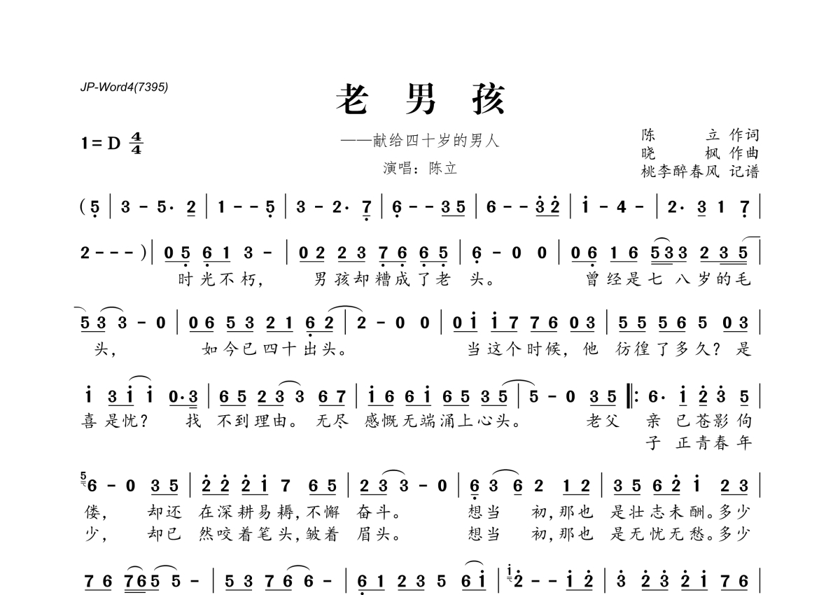 《老男孩》是陈立演唱的一首歌曲,拍号为4/4拍,这份简谱共有一张高清图谱,图谱由 @桃李醉春风 编配上传。
