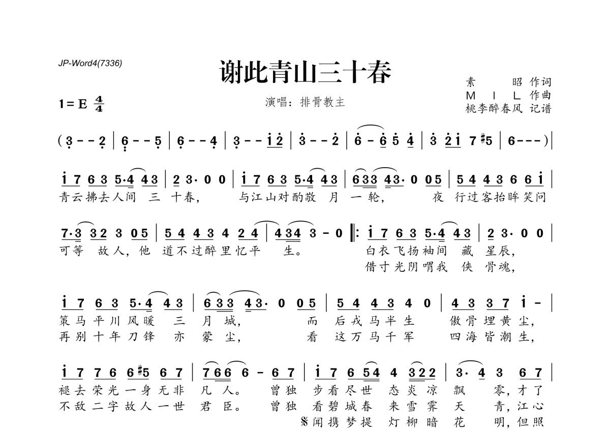 《谢此青山三十春》是排骨教主演唱的一首歌曲,拍号为4/4拍,这份简谱共有一张高清图谱,图谱由 @桃李醉春风 编配上传。