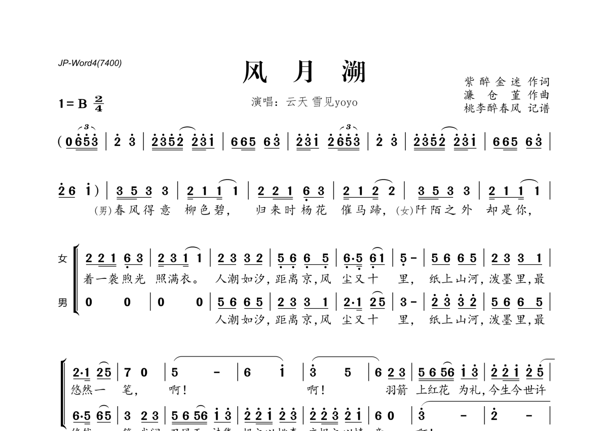 《风月溯》是云天&雪见Yoyo演唱的一首歌曲,拍号为2/4拍,这份简谱共有两张高清图谱,图谱由 @桃李醉春风 编配上传。