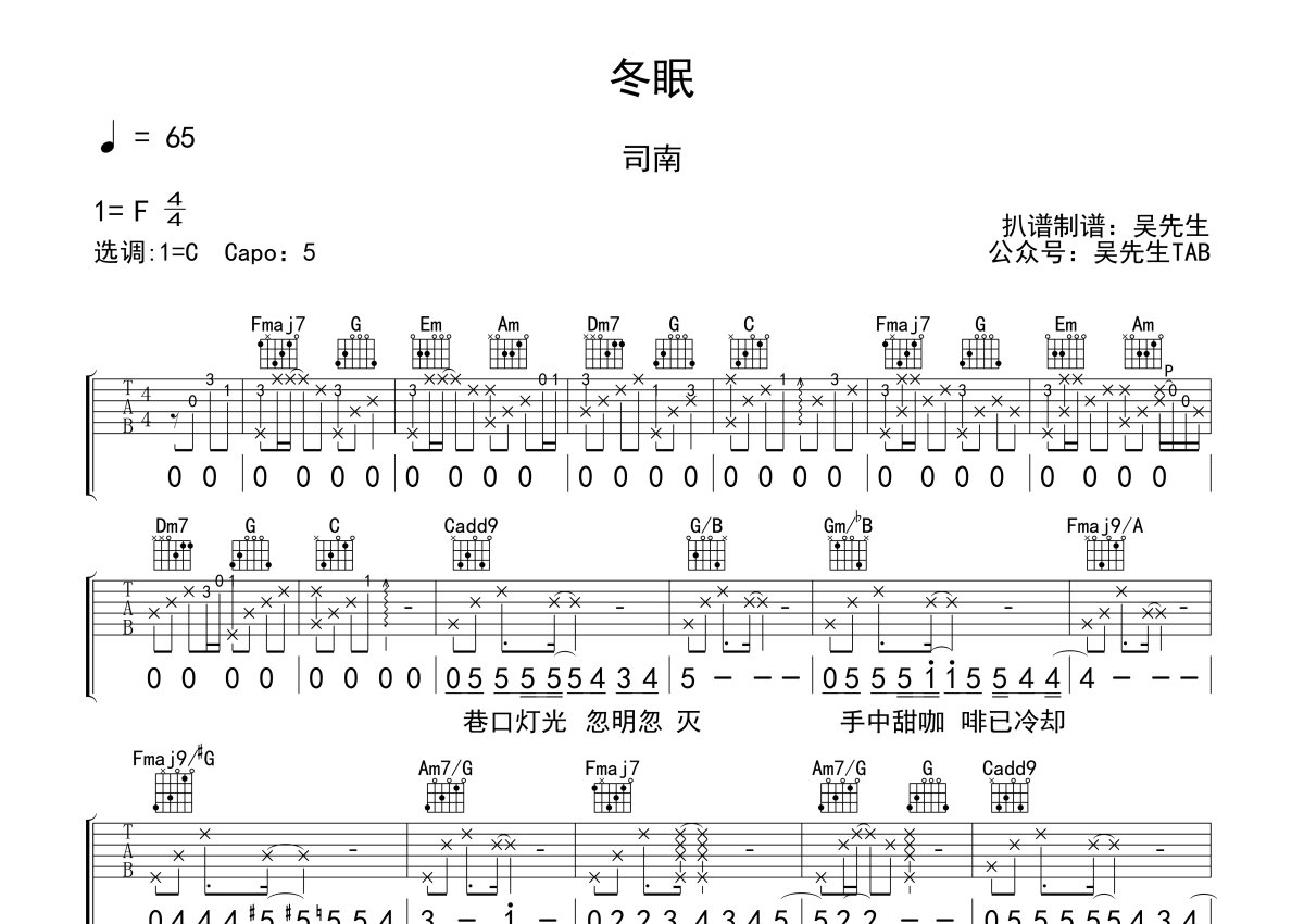 司南《冬眠》吉他谱 - C调弹唱六线谱