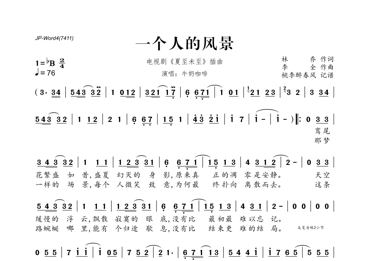 《一个人的风景》是牛奶咖啡演唱的一首歌曲,拍号为2/4拍,这份简谱共有一张高清图谱,图谱由 @桃李醉春风 编配上传。