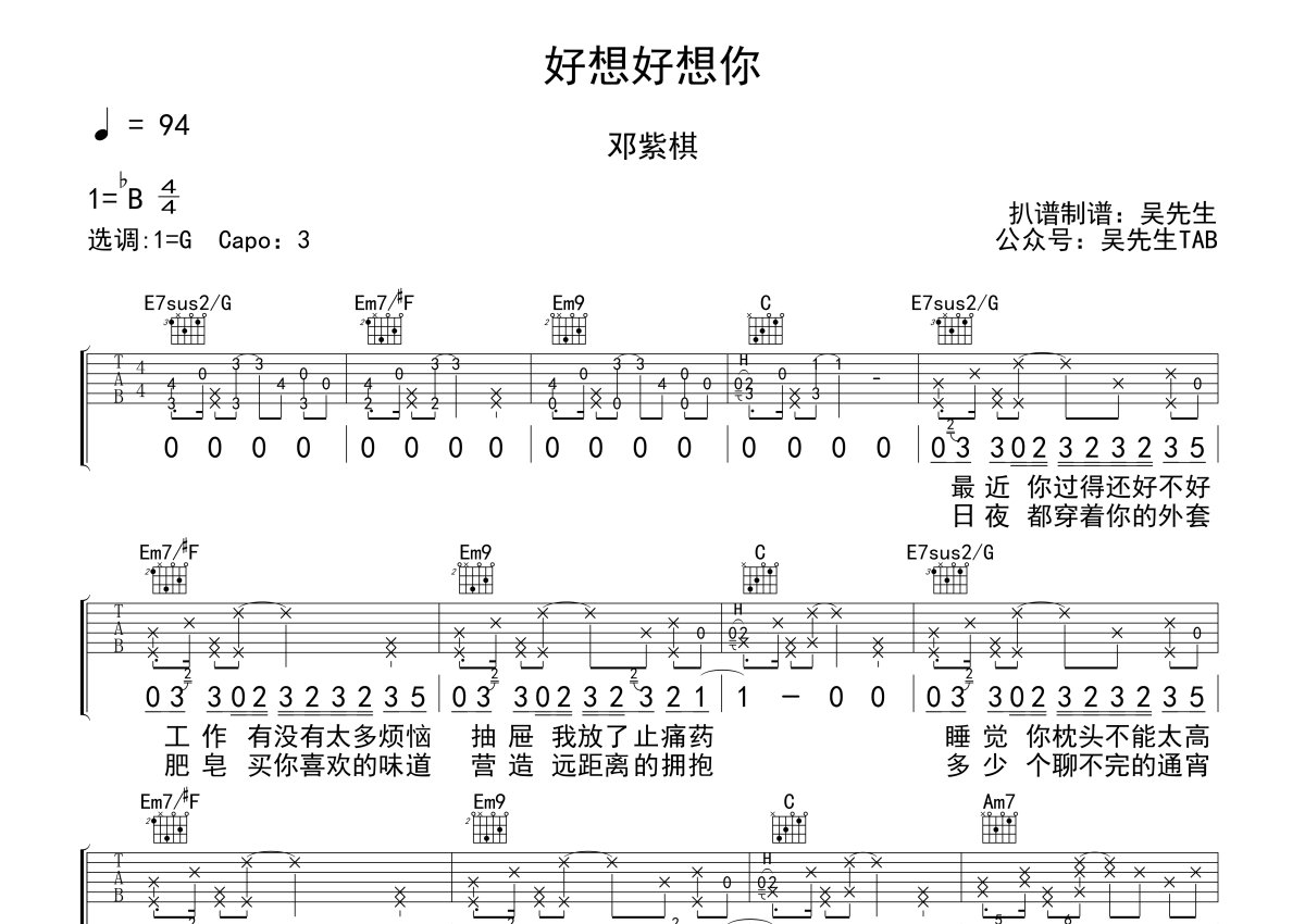 《好想好想你》是邓紫棋演唱的一首歌曲,本吉他谱采用的是G调指法编配,这份吉他谱共有两张高清图谱,图谱由 @吴先生TAB 编配上传,图谱使用六线谱编配,包含吉他和弦指法、简谱以及歌词部分,使用这份好想好想你吉他谱,可以让你更加方便地掌握这首歌曲的弹唱技巧,快来尝试吧。邓紫棋《好想好想你》吉他谱_G调吉他弹唱谱。