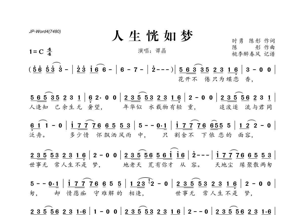 《人生恍如梦》是谭晶演唱的一首歌曲,拍号为4/4拍,这份简谱共有一张高清图谱,图谱由 @桃李醉春风 编配上传。