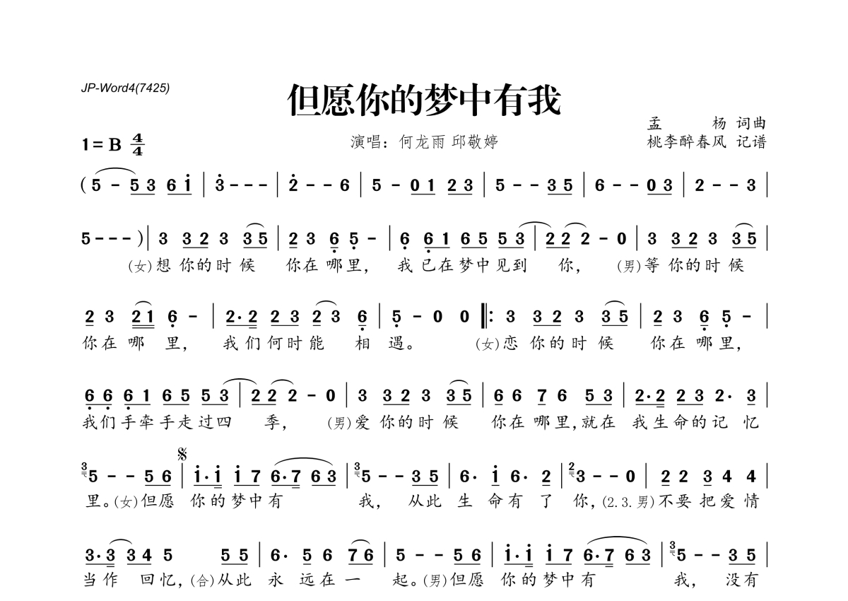 《但愿你的梦中有我》是何龙雨&邱敬婷演唱的一首歌曲,拍号为4/4拍,这份简谱共有一张高清图谱,图谱由 @桃李醉春风 编配上传。