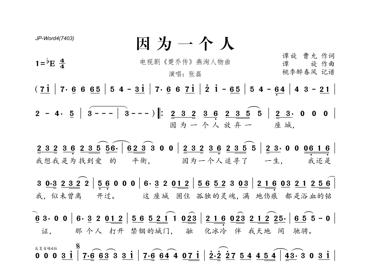《因为一个人》是张磊演唱的一首歌曲,拍号为4/4拍,这份简谱共有一张高清图谱,图谱由 @桃李醉春风 编配上传。