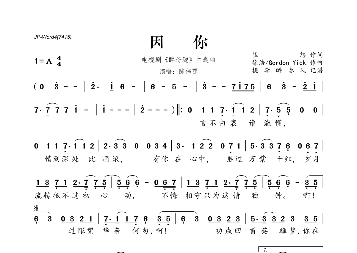 《因你》是陈伟霆演唱的一首歌曲,拍号为4/4拍,这份简谱共有一张高清图谱,图谱由 @桃李醉春风 编配上传。