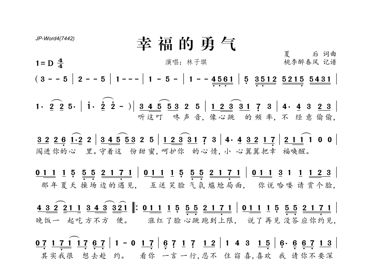 《幸福的勇气》是林子琪演唱的一首歌曲,拍号为4/4拍,这份简谱共有一张高清图谱,图谱由 @桃李醉春风 编配上传。