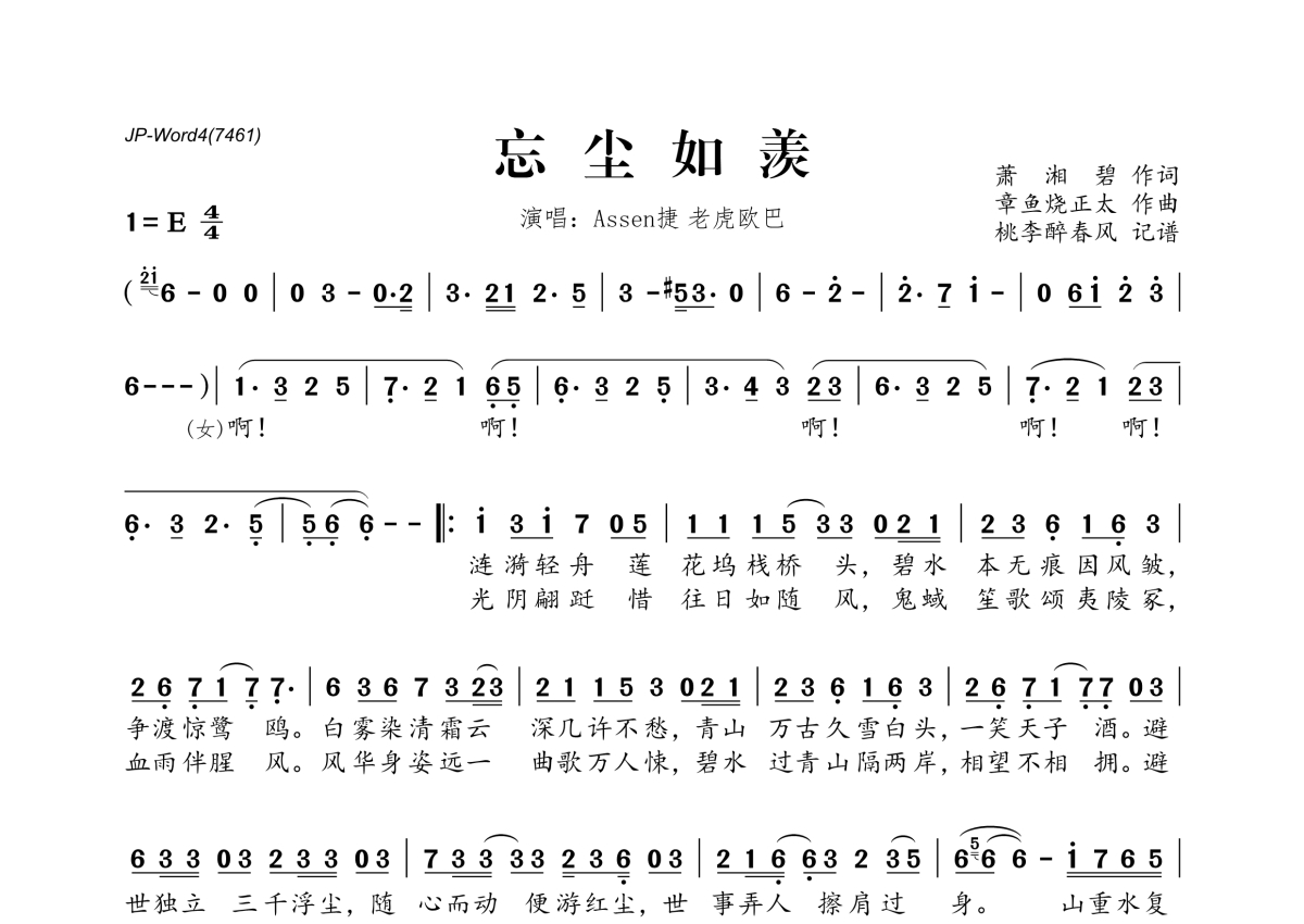 《忘尘如羡》是Assen捷&老虎欧巴演唱的一首歌曲,拍号为4/4拍,这份简谱共有两张高清图谱,图谱由 @桃李醉春风 编配上传。