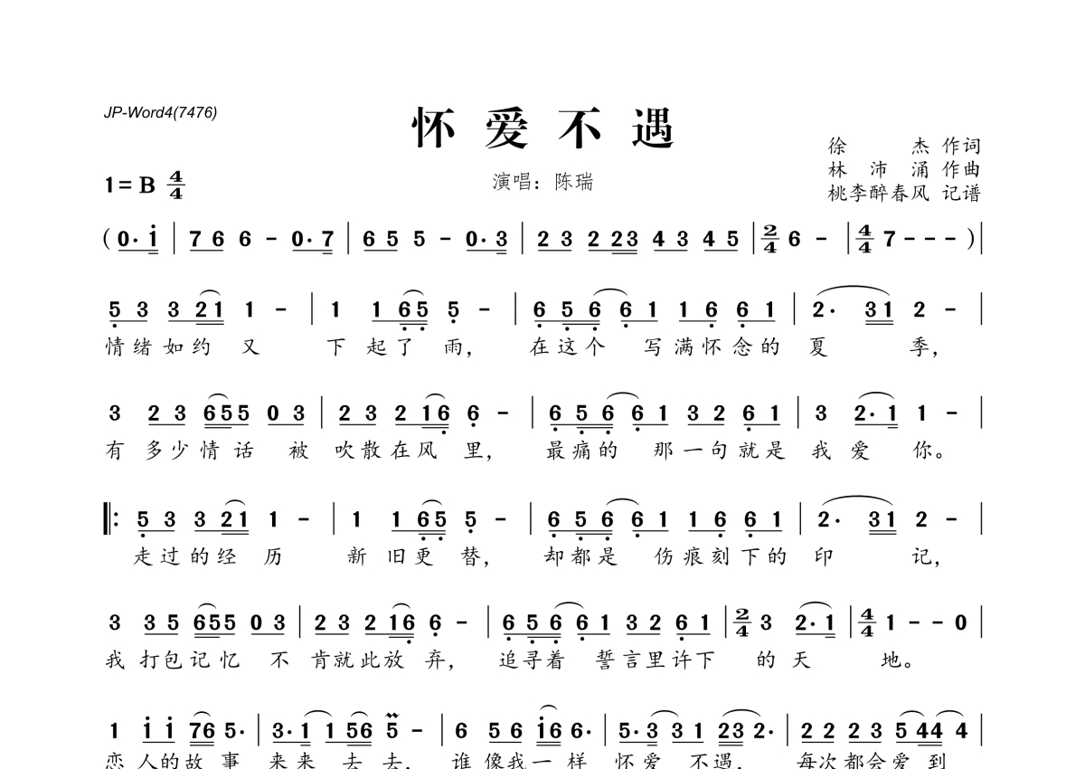 《怀爱不遇》是陈瑞演唱的一首歌曲,拍号为4/4拍,这份简谱共有一张高清图谱,图谱由 @桃李醉春风 编配上传。