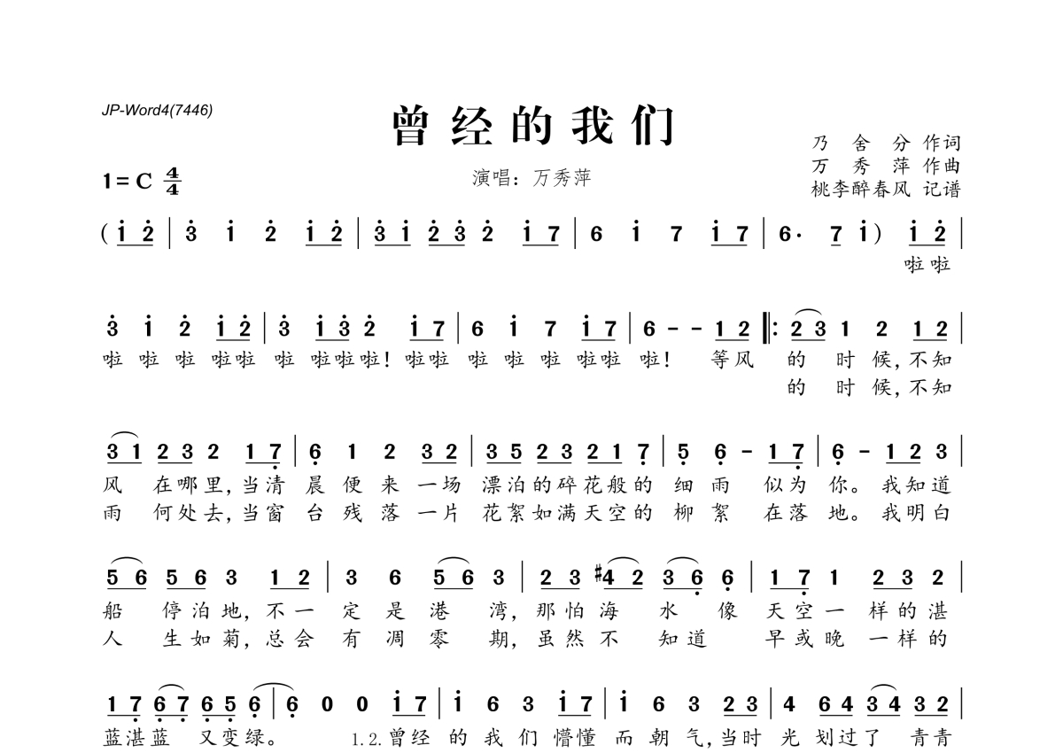 《曾经的我们》是万秀萍演唱的一首歌曲,拍号为4/4拍,这份简谱共有一张高清图谱,图谱由 @桃李醉春风 编配上传。