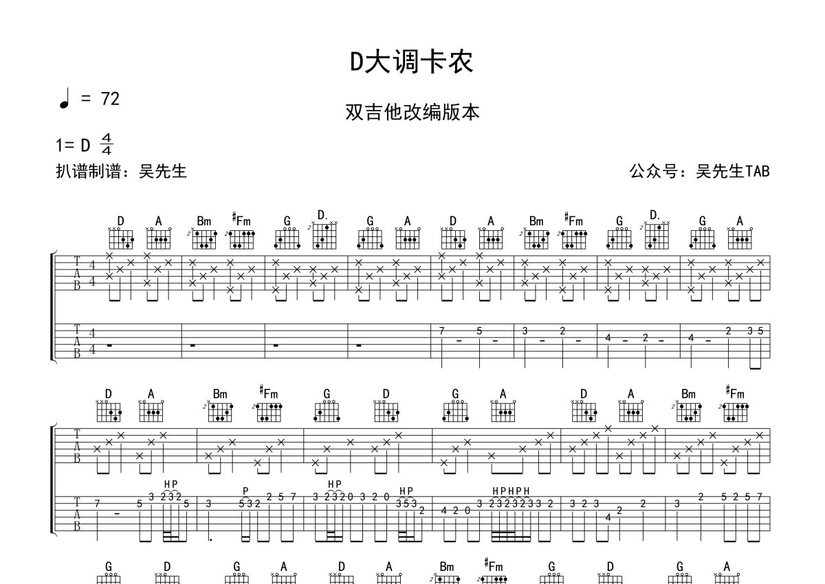《D大调卡农》,双吉他改编版本,本吉他谱采用的是D调指法编配,这份吉他谱共有两张高清图谱,图谱由 @吴先生TAB 编配上传,图谱使用六线谱编配,使用这份D大调卡农吉他谱,可以让你更加方便地掌握这首歌曲的演奏技巧,快来尝试吧。《D大调卡农》吉他谱_D调吉他独奏谱_双吉他改编版本。