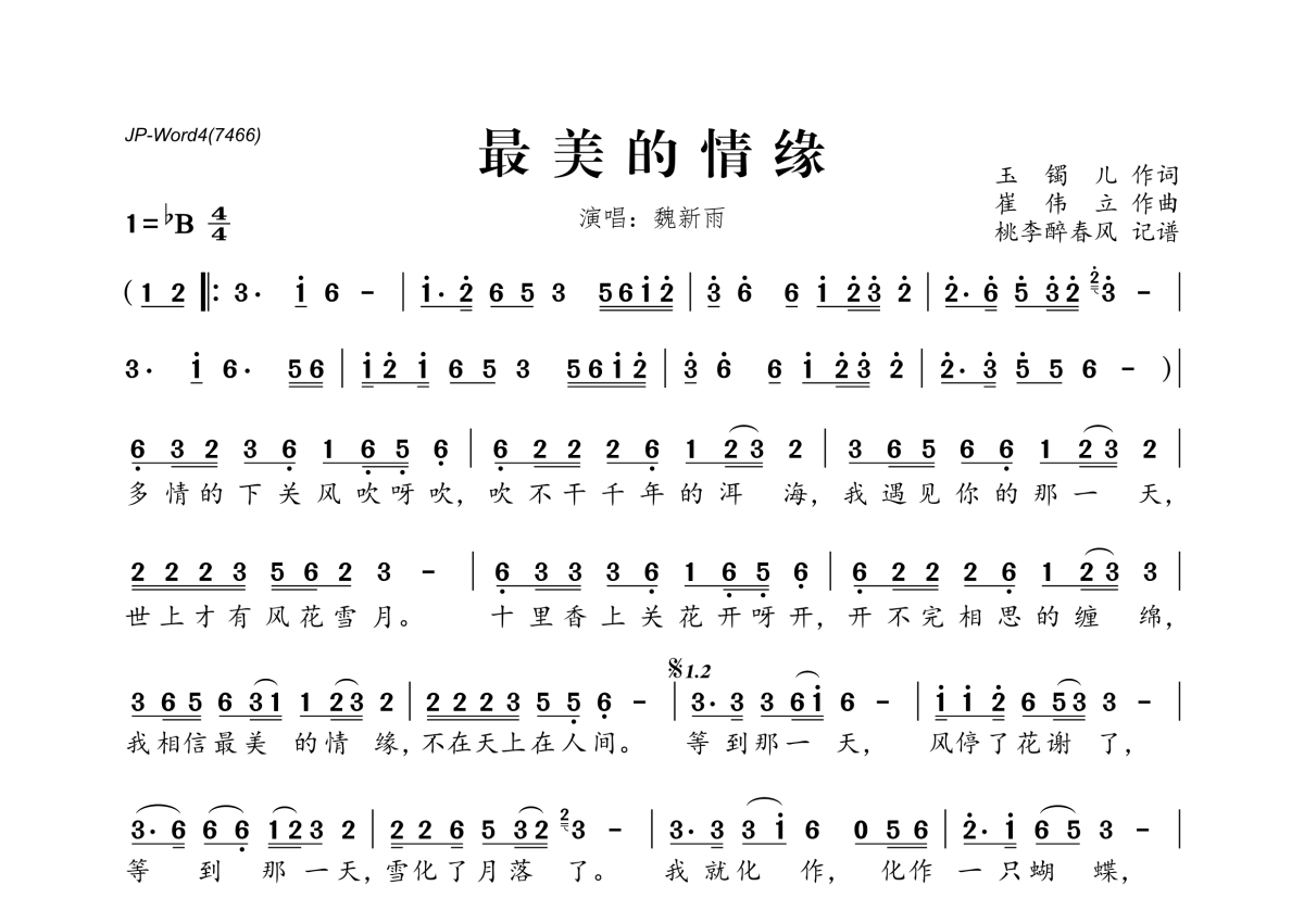 《最美的情缘》是魏新雨演唱的一首歌曲,拍号为4/4拍,这份简谱共有一张高清图谱,图谱由 @桃李醉春风 编配上传。