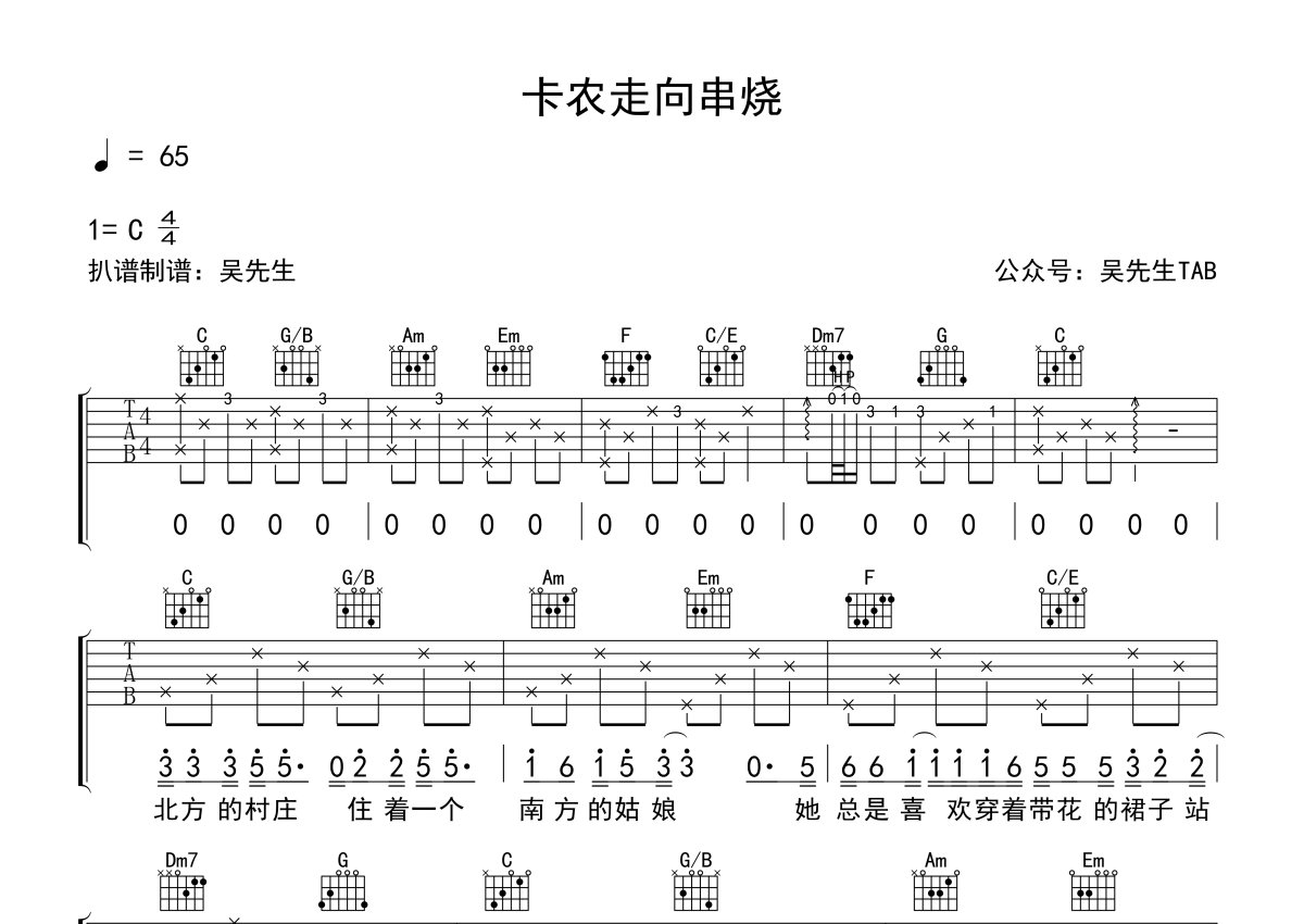 《卡农走向串烧》,本吉他谱采用的是C调指法编配,这份吉他谱共有四张高清图谱,图谱由 @吴先生TAB 编配上传,图谱使用六线谱编配,包含吉他和弦指法、简谱以及歌词部分,使用这份卡农走向串烧吉他谱,可以让你更加方便地掌握这首歌曲的弹唱技巧,快来尝试吧。《卡农走向串烧》吉他谱_C调吉他弹唱谱。