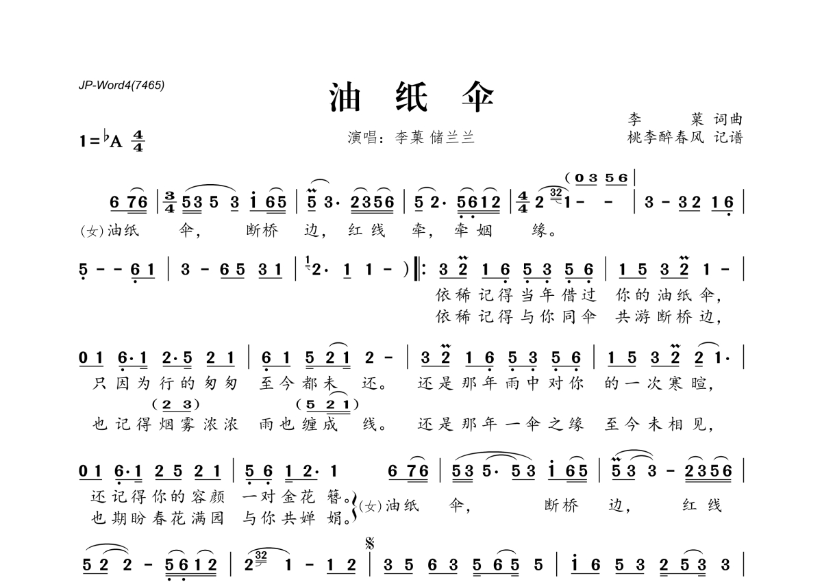 《油纸伞》是李菓&储兰兰演唱的一首歌曲,拍号为4/4拍,这份简谱共有一张高清图谱,图谱由 @桃李醉春风 编配上传。