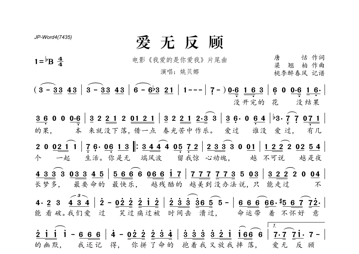 《爱无反顾》是姚贝娜演唱的一首歌曲,拍号为4/4拍,这份简谱共有一张高清图谱,图谱由 @桃李醉春风 编配上传。