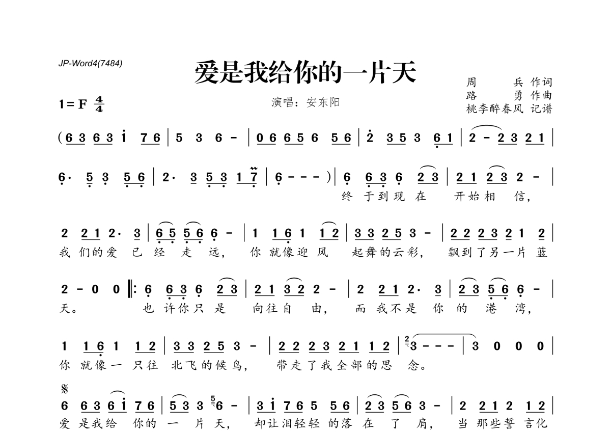 《爱是我给你的一片天》是安东阳演唱的一首歌曲,拍号为4/4拍,这份简谱共有一张高清图谱,图谱由 @桃李醉春风 编配上传。