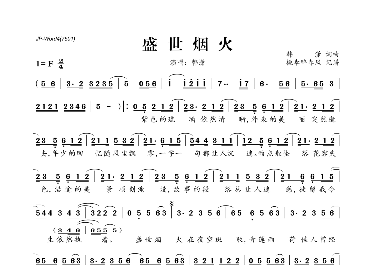 《盛世烟火》是韩潇演唱的一首歌曲,拍号为2/4拍,这份简谱共有一张高清图谱,图谱由 @桃李醉春风 编配上传。