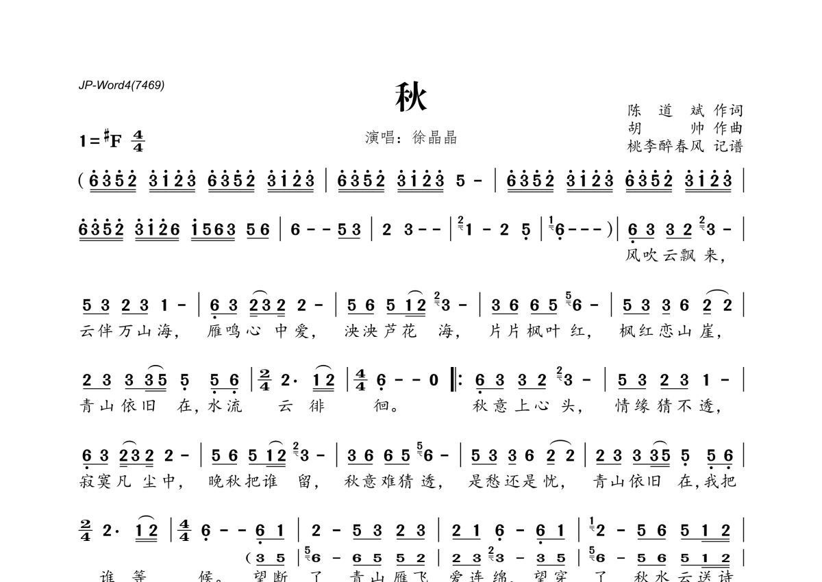 《秋》是徐晶晶演唱的一首歌曲,拍号为4/4拍,这份简谱共有一张高清图谱,图谱由 @桃李醉春风 编配上传。