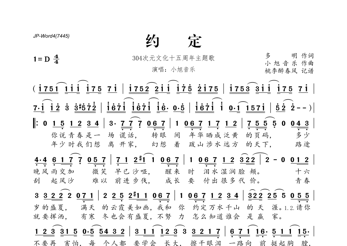 《约定》是小旭音乐演唱的一首歌曲,拍号为4/4拍,这份简谱共有一张高清图谱,图谱由 @桃李醉春风 编配上传。