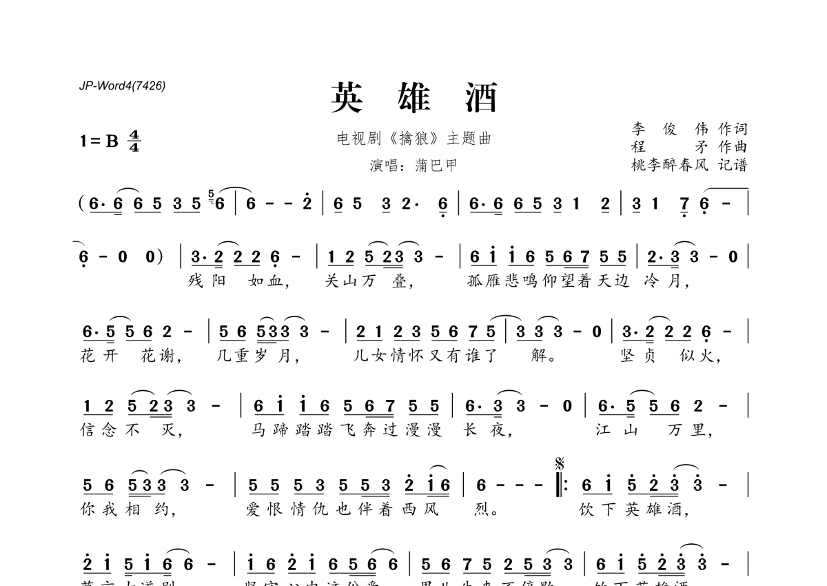 《英雄酒》是蒲巴甲演唱的一首歌曲,拍号为4/4拍,这份简谱共有一张高清图谱,图谱由 @桃李醉春风 编配上传。
