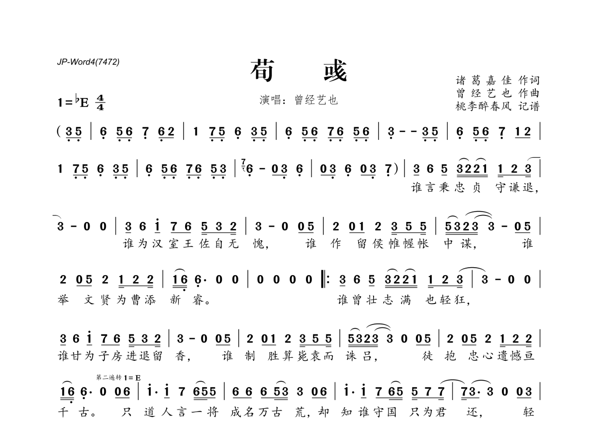 荀彧简谱 - 曾经艺也演唱