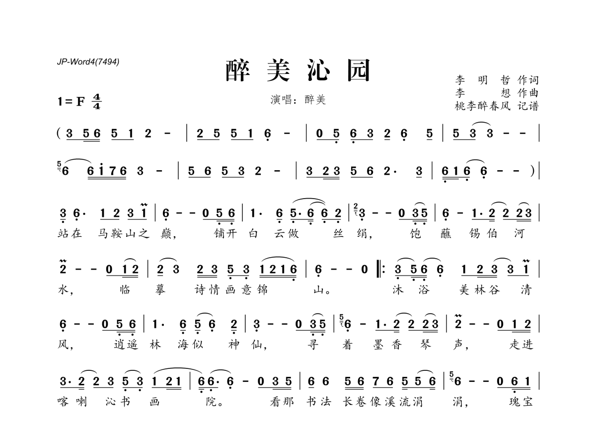 《醉美沁园》是醉美演唱的一首歌曲,拍号为4/4拍,这份简谱共有一张高清图谱,图谱由 @桃李醉春风 编配上传。