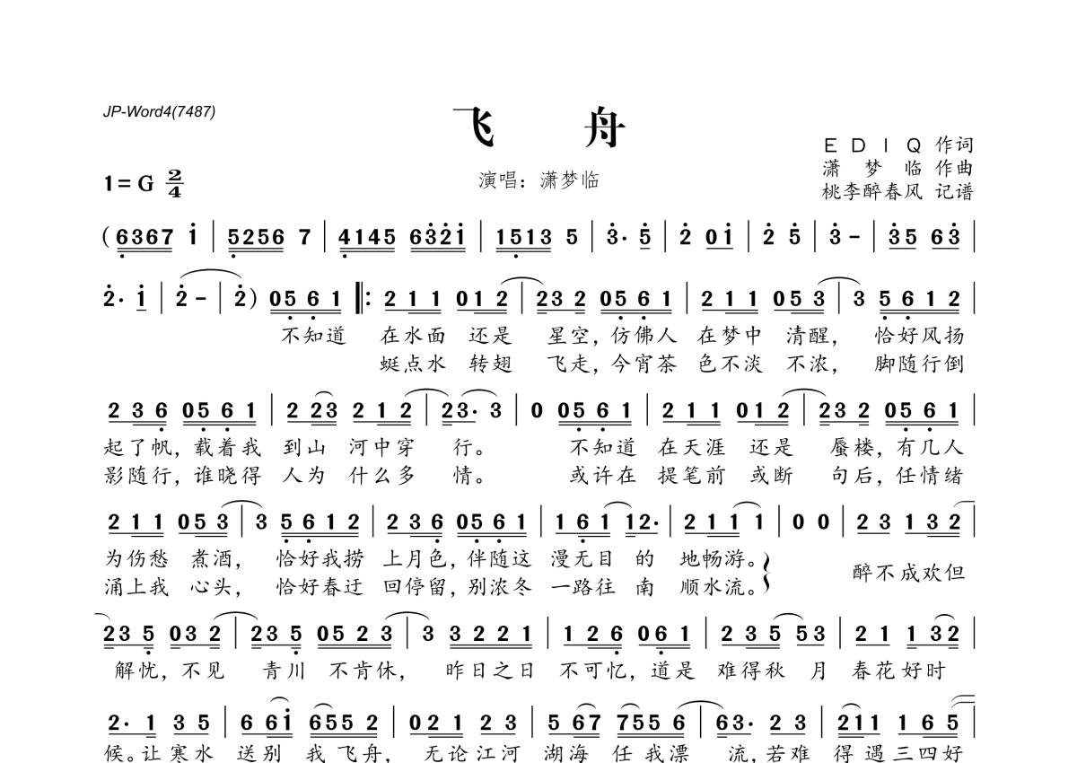 《飞舟》是潇梦临演唱的一首歌曲,拍号为2/4拍,这份简谱共有一张高清图谱,图谱由 @桃李醉春风 编配上传。