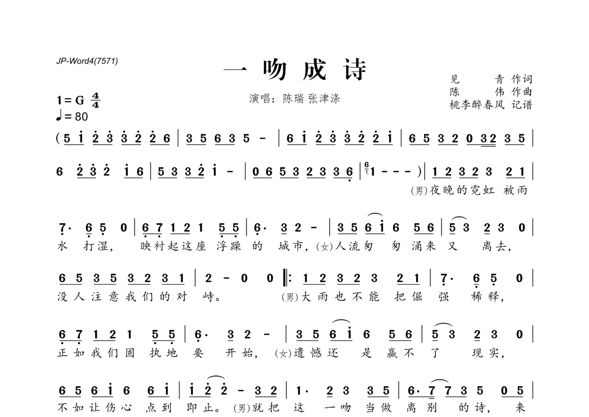 一吻成诗简谱 - 陈瑞&张津涤演唱