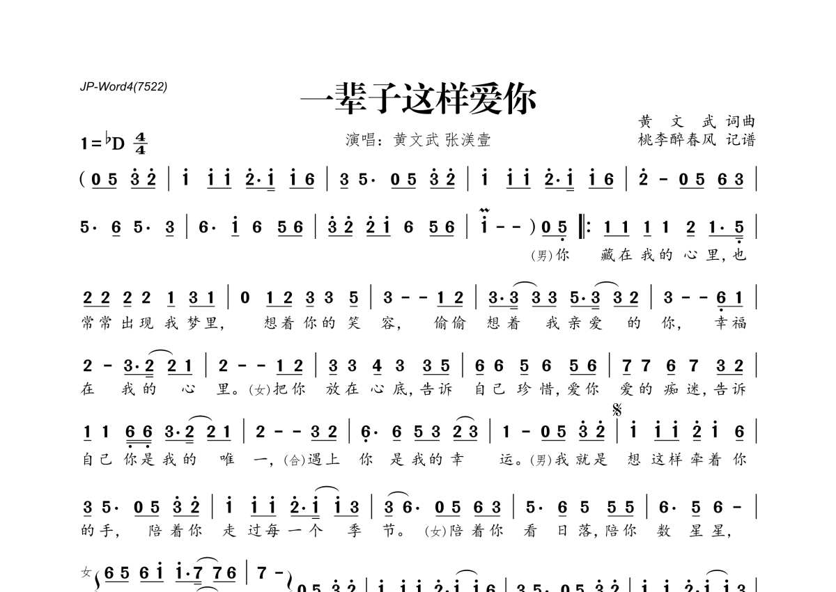 黄文武&张渼壹《一辈子这样爱你》简谱
