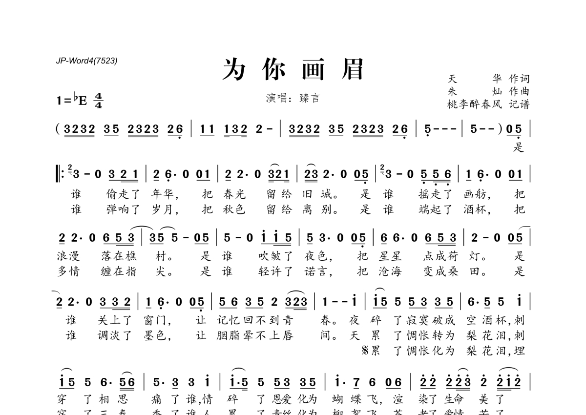《为你画眉》是臻言演唱的一首歌曲,拍号为4/4拍,这份简谱共有一张高清图谱,图谱由 @桃李醉春风 编配上传。