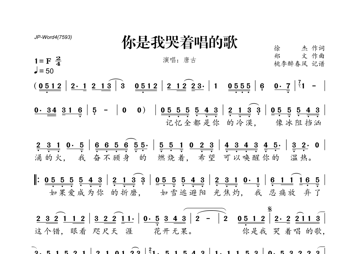 《你是我哭着唱的歌》是唐古演唱的一首歌曲,拍号为2/4拍,这份简谱共有一张高清图谱,图谱由 @桃李醉春风 编配上传。