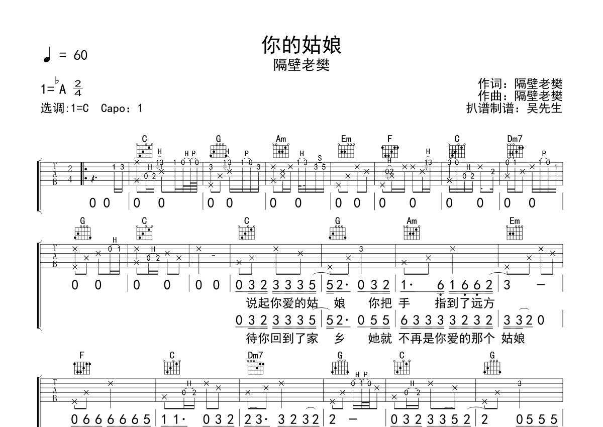 隔壁老樊《你的姑娘》吉他谱 - C调弹唱六线谱 - 免翻页版本