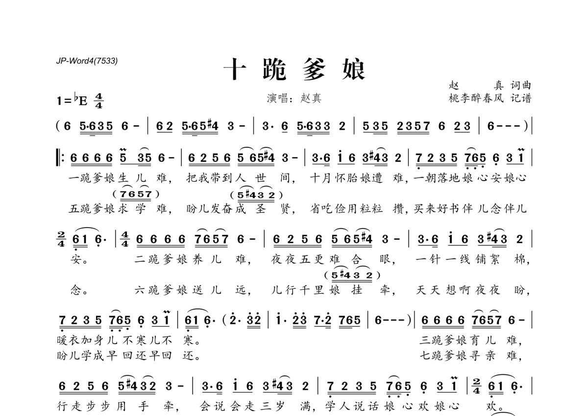 《十跪爹娘》是赵真演唱的一首歌曲,拍号为4/4拍,这份简谱共有一张高清图谱,图谱由 @桃李醉春风 编配上传。